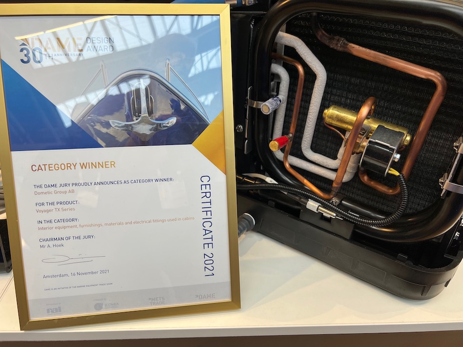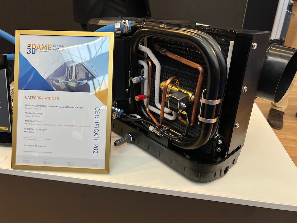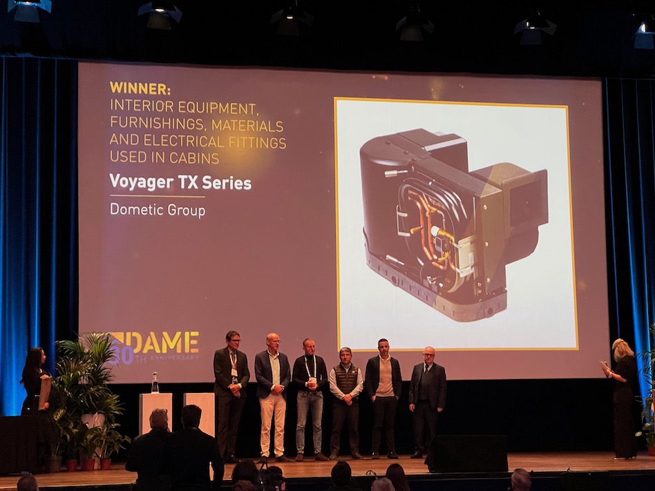 Jednym z ciekawszych eksponatów był klimatyzator o zmiennej wydajności Voyager TX, innowacyjnej serii opracowanej przez firmę DOMETIC. Jego premiera miała miejsce 1 października br., a już 16 listopada w pierwszym dniu targów otrzymał prestiżowe wyróżnienie Najlepszego Produktu w kategorii: Wyposażenie wnętrz, Wyposażenie, Materiały i Osprzęt Elektryczny konkursu DAME Design Award 2021.