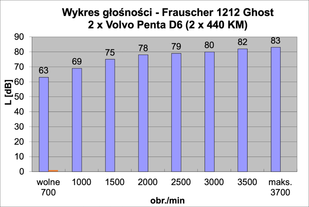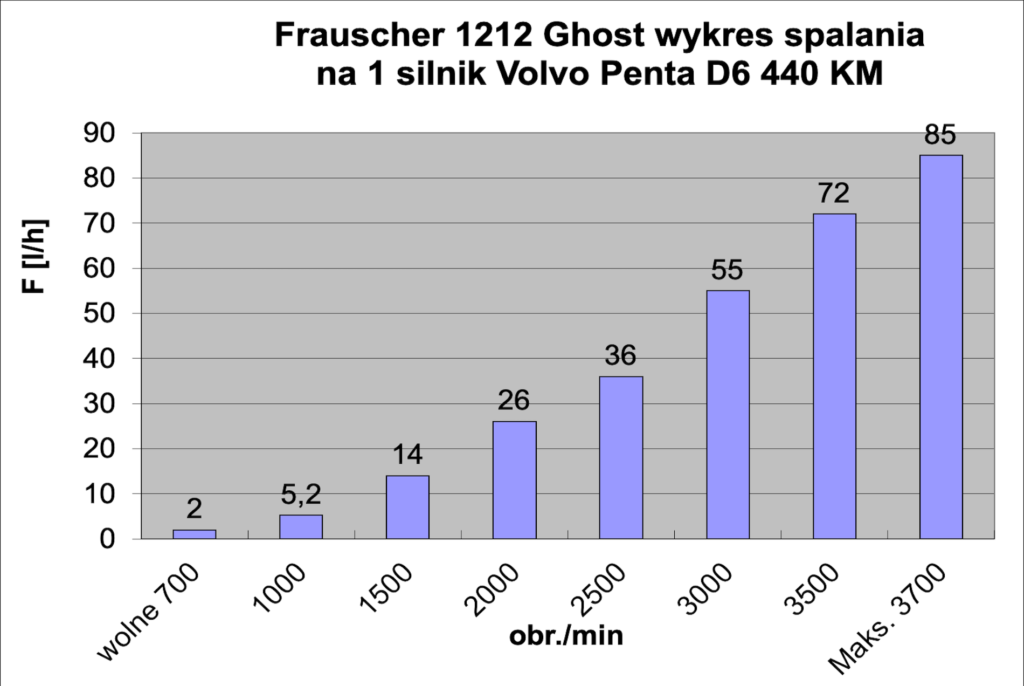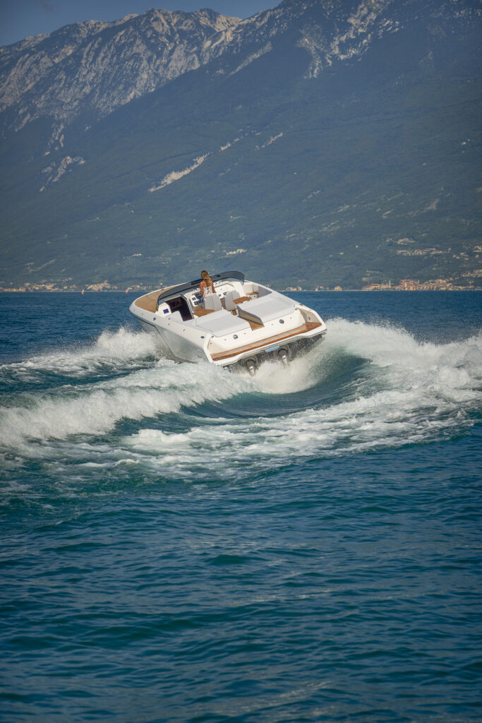 Nasze testy odbywały się na jeziorze Garda we Włoszech przy słonecznej sierpniowej pogodzie. Jak zwykle na Gardzie nie brakowało wiatru, który wieje tutaj regularnie rano i po południu. Mieliśmy więc także możliwość sprawdzenia go w jeździe po fali. Dwa silniki Volvo Penta D6 o mocy 440 KM bez problemu i szybko rozpędzały go do prędkości ślizgowej w zaledwie 5,5 s, przy około 2500 obr./min. W podstawowych próbach maksymalną prędkość 45 w osiągnęliśmy w czasie 23,5 s. Na otwartym pokładzie przy tej szybkości nie jest zbyt cicho (83dB), ale większy na to wpływ ma wiatr i fala niż hałas od silników. Jazda z taką prędkością (a w kolejnych próbach uzyskaliśmy nawet 48 w) nie należy niestety do ekonomicznej, spalanie na jeden silnik wynosi ponad 85 l/h. Najlepiej oczywiście pływać z szybkością cruisingowa 28-30 w. Wtedy i hałas jest mniejszy (79 dB), a i spalanie spada do 33-34 l/h.