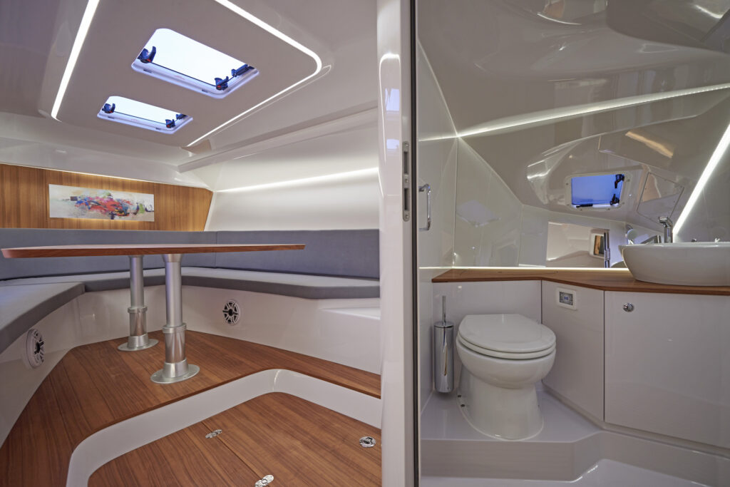 Jak już zauważyliśmy jest to główne miejsce przebywania dla całej załogi w czasie wodnej eksploracji. Główne miejsce zajmuje oczywiście centralnie położona sterówka, wyposażona we wszystkie urządzenia kontrolno-sterownicze zmontowane w sposób przyjazny dla sternika. W górnej części konsoli sterowniczej zamontowano zestaw tradycyjnych w designie, ale nowoczesnych elektronicznych okrągłych zegarów. Poniżej wstawiono duży 12” wyświetlacz Raymarine oraz pozostałe sterowniki, wyłączniki, joystick, manetkę itp. urządzenia. Wszystko jest blisko „w zasięgu ręki”, dobrze widoczne i łatwe w obsłudze. Ponad konsolą znajduje się niezbyt wysoka owiewka wykonana z jednej części z tworzywa sztucznego. Na testowanym jachcie była ona w wersji przyciemnionej i był to jedyny element na łodzi, do którego mieliśmy małe zastrzeżenia. Przy padających pionowo z góry promieniach słonecznych światło odbijało się od białego „podszybia” i …praktycznie nic nie było przez nią widać, zmuszając nas do prowadzenia łodzi w pozycji stojącej i wystawiając się na strugi wiatru. Wydaje się, że lepiej byłoby górny element konsoli wykonać w ciemnym kolorze lub po prostu zamówić owiewkę przezroczystego tworzywa. Za konsolą są dwa wygodne fotele, za którymi jest miejsce do biesiadowania i wypoczywania załogi. Mamy tam dwie kanapy w literę „C” na każdej burcie, okalające eleganckie stoliki drewniane. Za nimi na rufie, na pokrywie komory silnikowej dwa obszerne sunpady zachęcają do błogiego leżakowania i kąpieli słonecznych. W standardowym wyposażeniu mamy jeszcze dwie lodówki i mały zlewozmywak oraz składane bimini, całkowicie schowane za oparciami kanap. Producent dopuszcza pływanie z nim z maksymalną prędkością nie przekraczającą 30 w, a więc z praktyczną szybkością cruisingową.