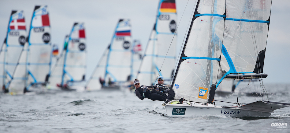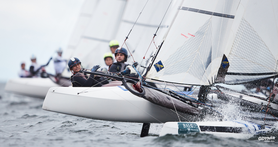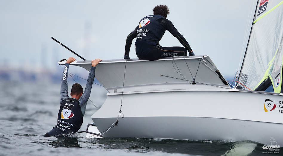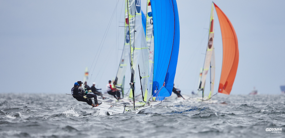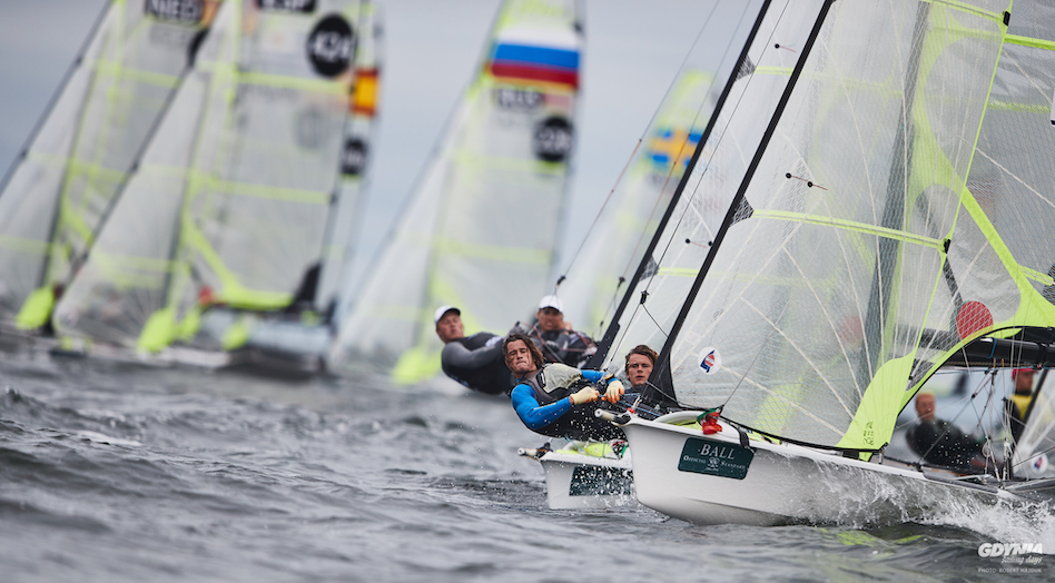 Bardzo dobrze spisują się także Tytus Butowski (AZS AWFiS Gdańsk) i Łukasz Machowski (MKS Dwójka Warszawa), którzy drugiego dnia regat wygrali w swojej grupie drugi wyścig, dopłynęli też na metę na piątej i siódmej pozycji, co w sumie dało im awans o jedną lokatą – z siódmej na szóstą. W stawce 43 załóg z 18 państw 17. miejsce zajmują Adam Głogowski i Maciej Krusiec (Nauticus YC Olsztyn), a 38. Mateusz Ksobich i Patryk Różak (OŚ AZS Poznań).