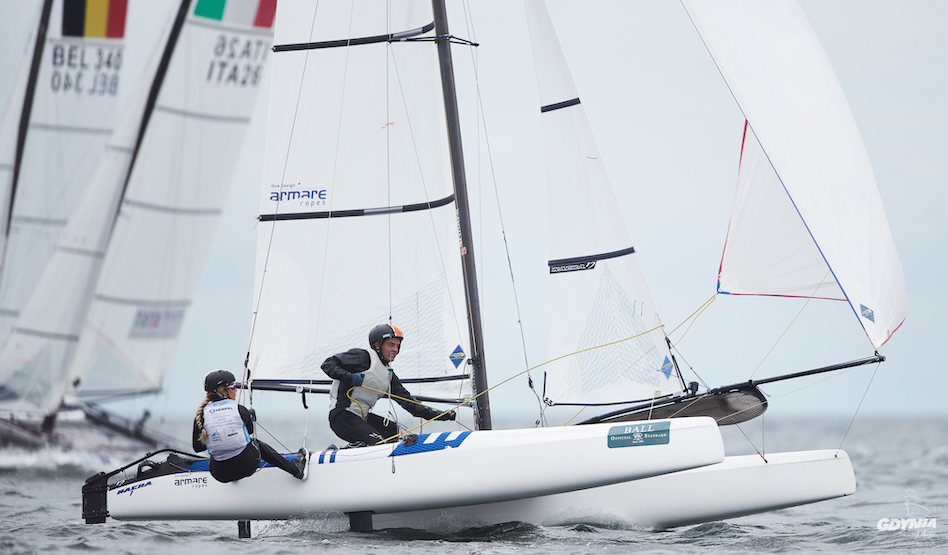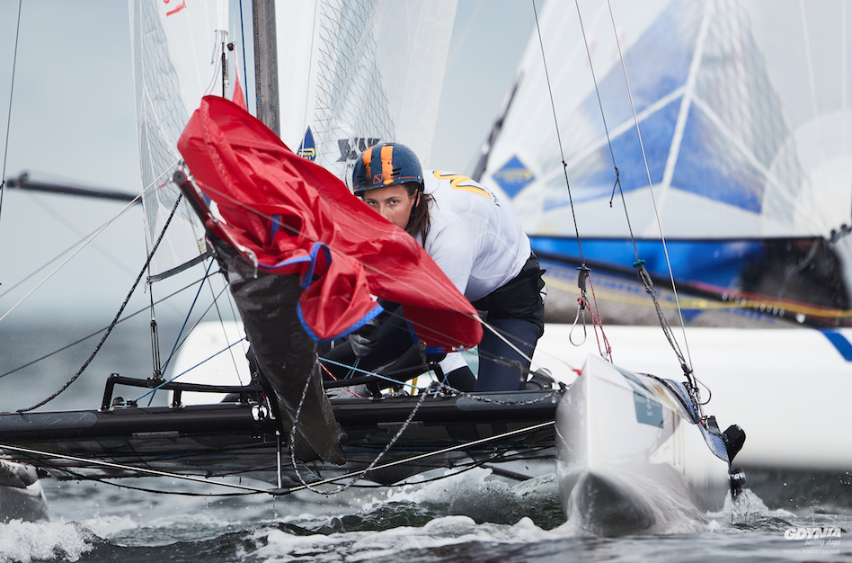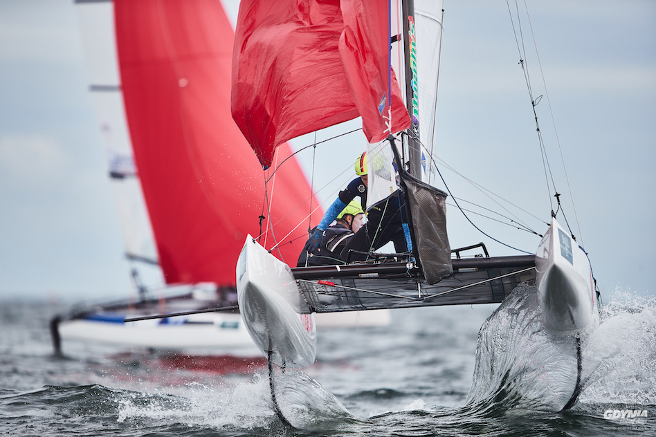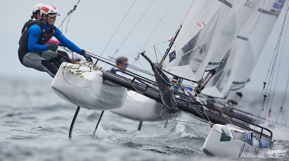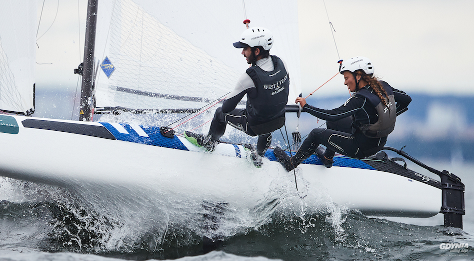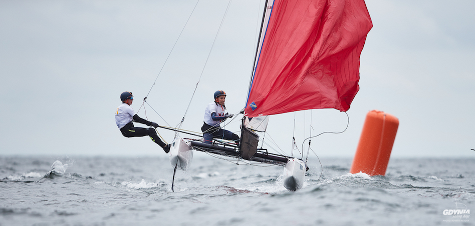Wśród 14 załóg z dziewięciu państw w katamaranach Nacra 17 nie ma biało-czerwonych. Po sześciu wyścigach na pierwszym miejscu nadal znajdują się Włosi Gianluigi Ugolini i Maria Giubilei, a kolejne lokaty zajmują Niemcy Jesse Lindstadt i Jill Paland oraz Francuzi Margaux Billy i Leo Maurin.