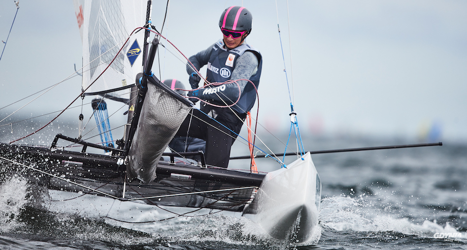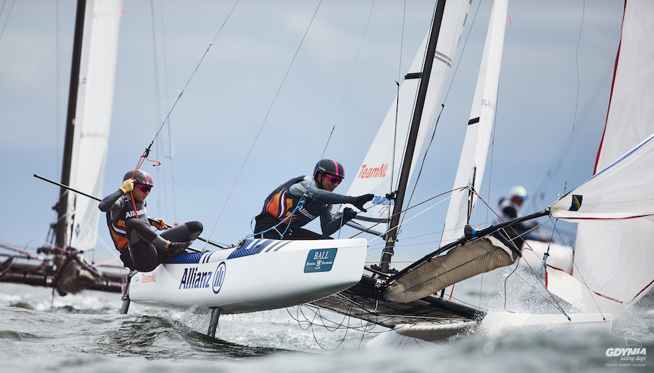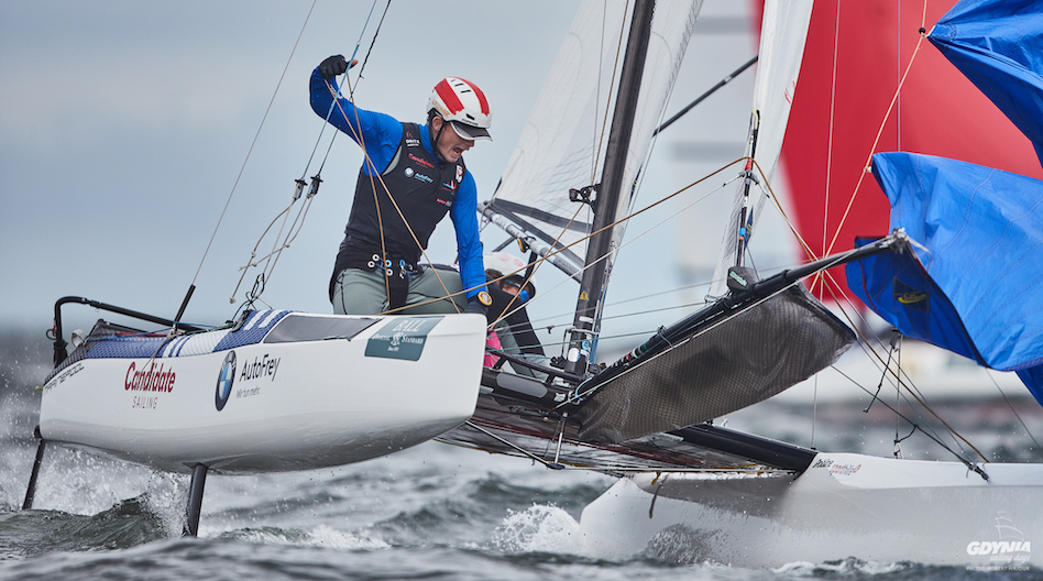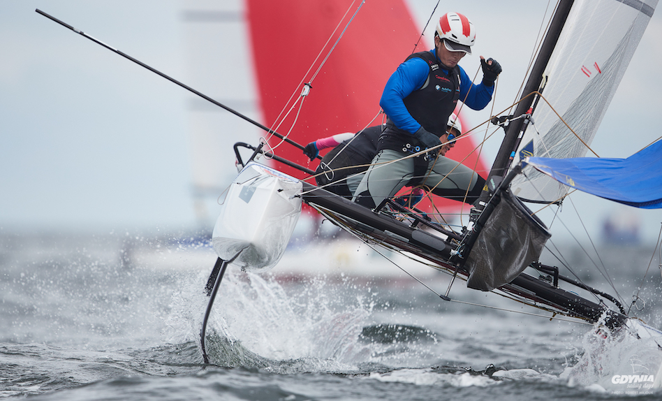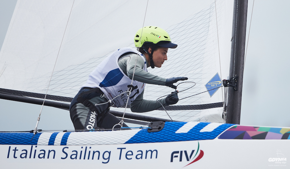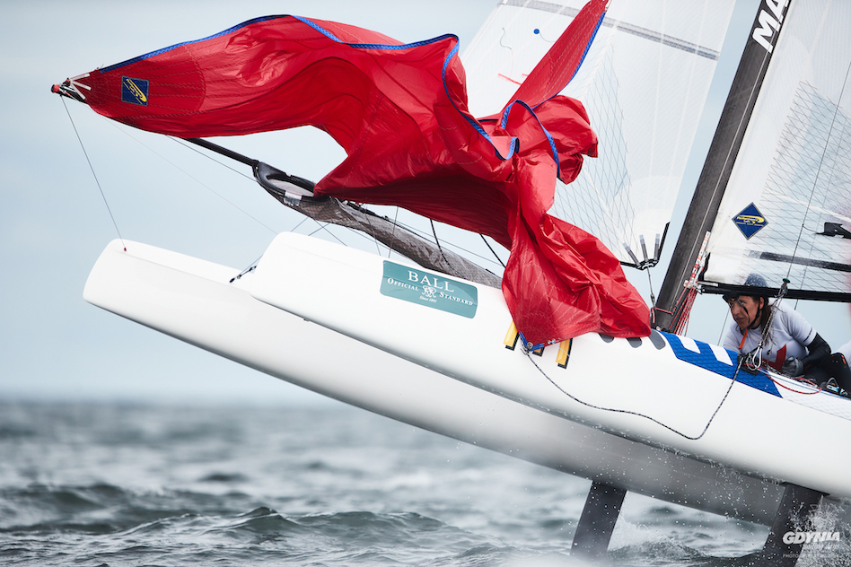 Wśród 14 załóg z dziewięciu państw w katamaranach Nacra 17 nie ma biało-czerwonych. Po sześciu wyścigach na pierwszym miejscu nadal znajdują się Włosi Gianluigi Ugolini i Maria Giubilei, a kolejne lokaty zajmują Niemcy Jesse Lindstadt i Jill Paland oraz Francuzi Margaux Billy i Leo Maurin.