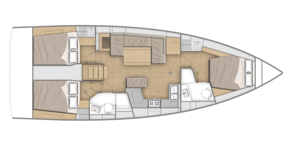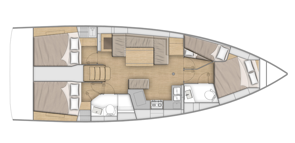 Przednia kabina jest przeznaczona dla armatora i w tej wersji wyposażona została w dodatkową umywalkę czy też rodzaj małej toaletki. Jest duża i wygodna. Nie zabrakło w niej także szafek na rzeczy osobiste. Naprawdę czuje się w niej przestrzeń do życia. W innej wersji kabina armatorska może być wyposażona we własną łazienkę. Wersja z czterema kabinami ma natomiast dwie przednie kajuty, w tym jedna z łóżkami piętrowymi.