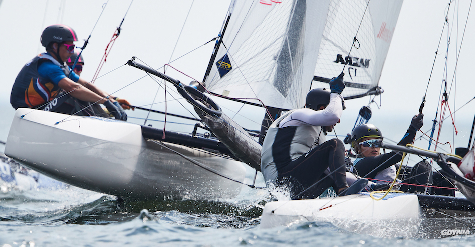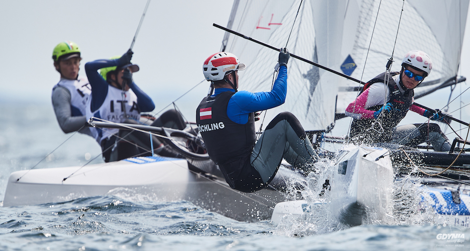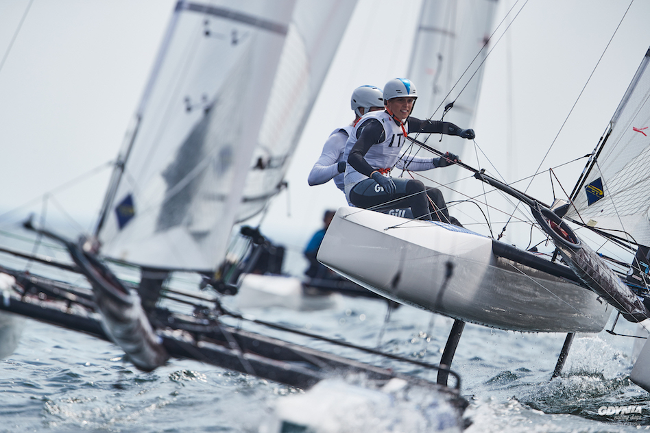 Wśród 14 załóg z dziewięciu państw w katamaranach Nacra 17 nie ma Polaków. Po trzech wyścigach liderują Włosi Gianluigi Ugolini i Maria Giubilei, drudzy są Francuzi Margaux Billy i Leo Maurin, a czołową trójkę zamykają Niemcy Jesse Lindstadt i Jill Paland.
