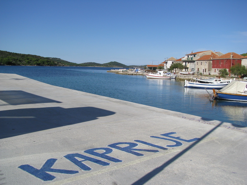 Jeżeli spędziliśmy noc na bojce u brzegów Zirje to na następną noc warto popłynąć na Kaprije – wyspę kwitnących kaparów. Głęboka zatoka prowadzi do krótkiego, betonowego mola, gdzie 2 razy dziennie przypływa prom z Sibeniku. Ten o 10:40 przywozi świeże pieczywo i prasę. Zanim przypłynie, przed sklepem gromadzą się kobiety na pogawędkę w porannym słońcu. Mężczyźni odpływają do pracy w Sibeniku i wrócą tym o 18:00.