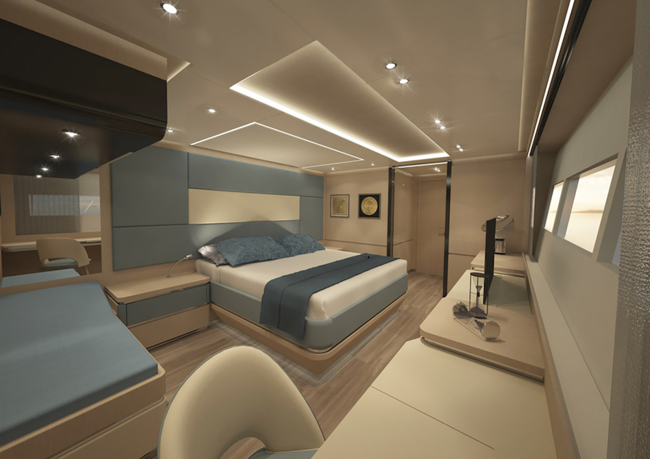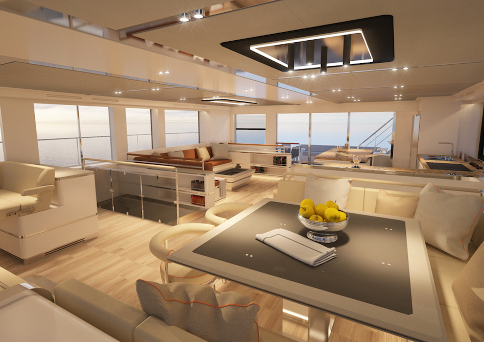 Na głównym pokładzie znajduje się kokpit główny o powierzchni około 60 m², z kambuzem, salonem i jadalnią. Dolny natomiast służy za sypialnię. Do dyspozycji mamy 4 lub 6 kabin dla gości oraz 1 lub 2 kabiny dla załogi. Wszystkie kajuty są dwuosobowe, z własnymi łazienkami.
