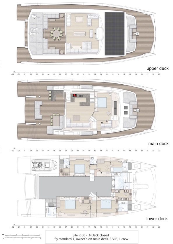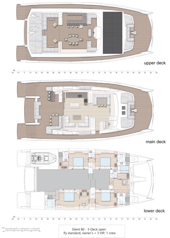 Katamaran SILENT 80 Tri-Deck jest wzbogaconą wersją flagowego modelu stoczni. Dostępny jest w dwóch wersjach zabudowy górnego pokładu: zamkniętej ze sky lounge lub otwartej z ogromnym flybridgem.