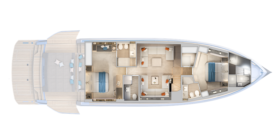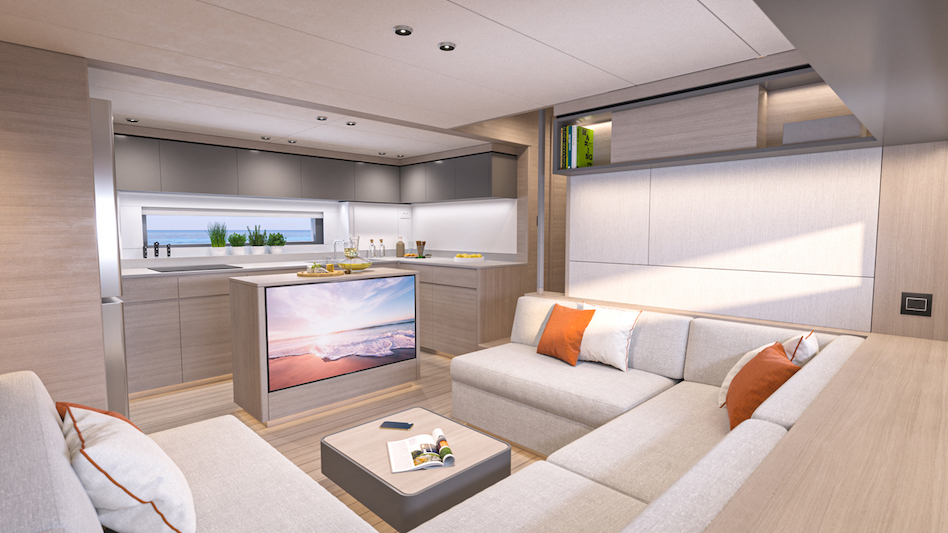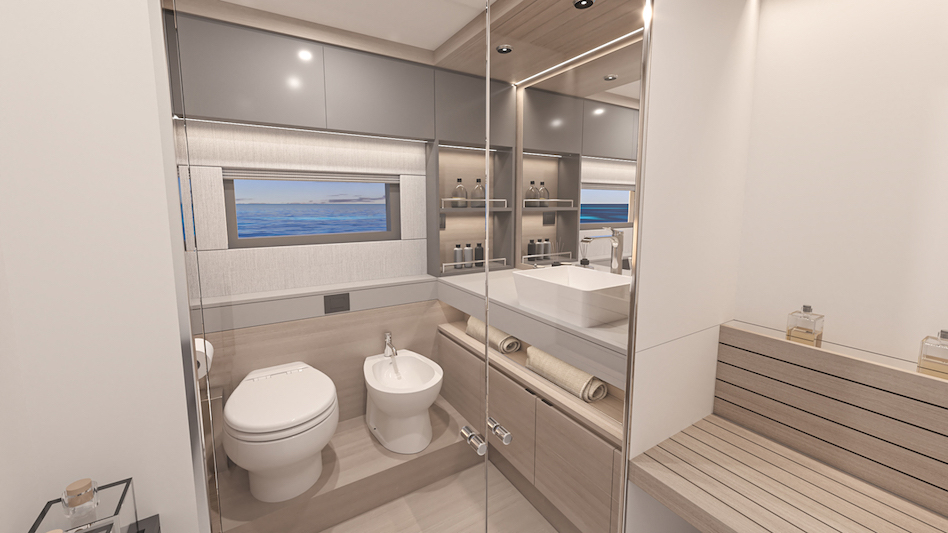 „Ale jest też wersja kambuzowa do bardziej towarzyskiego użytku rodzinnego, z miejscem poniżej na maksymalnie cztery kabiny dla gości, wszystkie z dużymi łazienkami i kabinami prysznicowymi, co jest trudne do zdobycia na sportowym jachcie tej wielkości” – dodaje Gino.