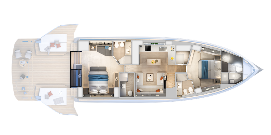 Wewnątrz układ został zaprojektowany tak, aby oferować wysoki stopień elastyczności i możliwości wyboru dla klienta. Standardowy układ obejmuje kuchnię na dolnym pokładzie (wersja „galley down”) i dwie dwuosobowe kabiny z obszernymi łazienkami.