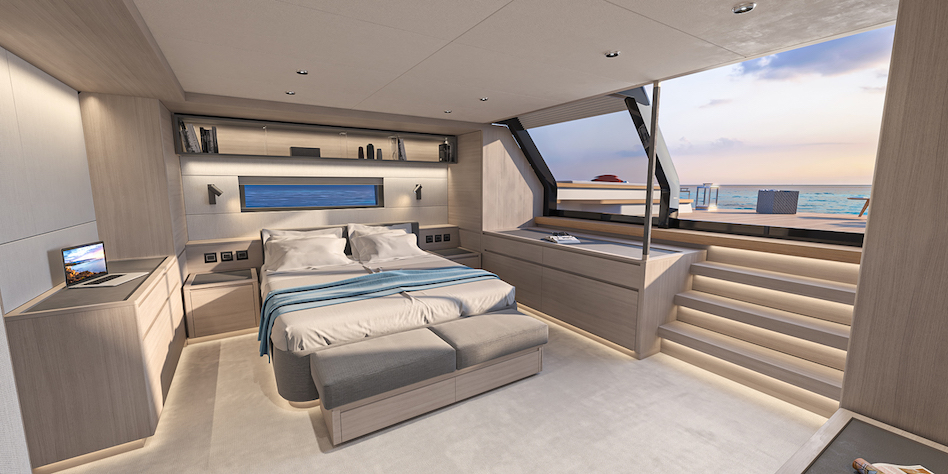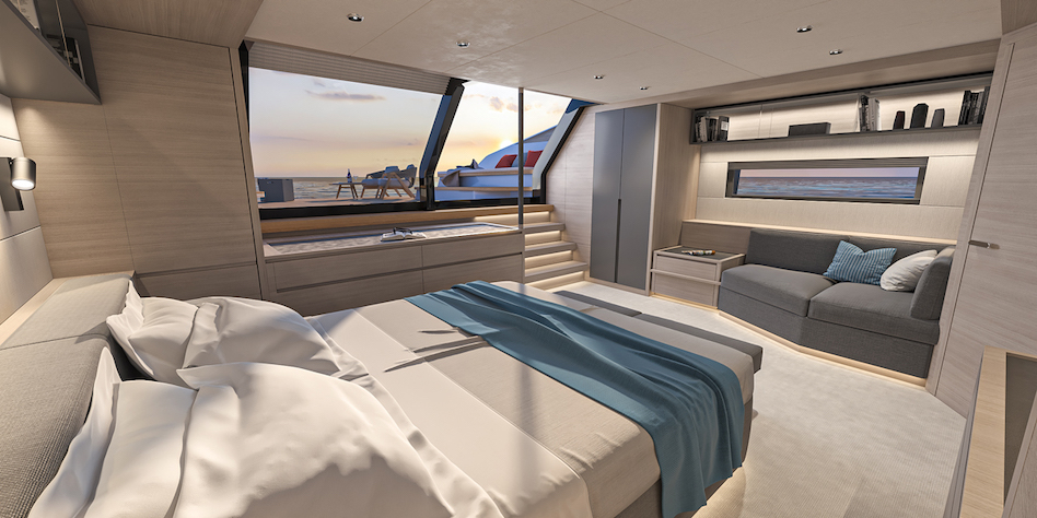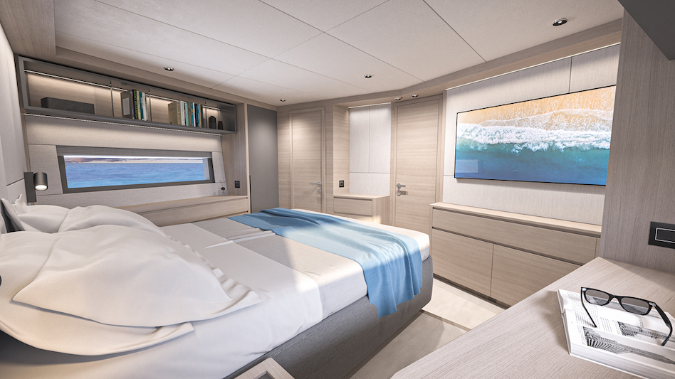 „Tutaj znowu pojawiła się potencjalna wada” — mówi Gino. „Jeśli goście spotykają się towarzysko na pokładzie rufowym, prywatność właściciela jest zagrożona. Oczywiście możesz zamknąć przesuwane szklane drzwi, ale o wiele przyjemniej jest zostawić je otwarte na kotwicy. Dlatego przed schodami w kabinie umieściliśmy strefę relaksu z sofą, z łóżkiem głównym ustawionym poprzecznie z boku i za roletą przeciwsłoneczną – proste rozwiązanie, które zapewnia pewien stopień prywatności nawet przy otwartych drzwiach”.