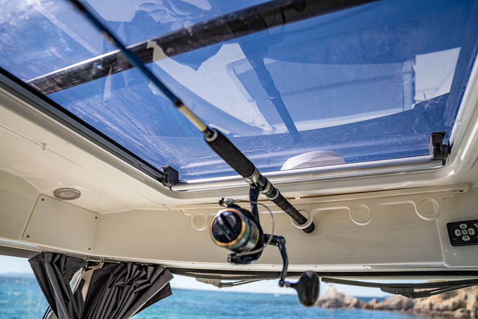 W lewej burcie, w kokpicie znajduje się specjalna wnęka ze schowkiem do transportu wędek. Kolejnym miejscem, gdzie możemy schować „kije” na czas podróży są uchwyty zainstalowane pod sufitem kabiny. Na testowanej łodzi mieliśmy tam właśnie schowane wędki i były naprawdę bezpieczne, mimo skoków na fali czy ostrych zwrotów. Również na dachu kabiny zainstalowane są specjalne solidne relingi, do których możemy przymocować dodatkowy sprzęt czy bagaż. Oczywiście musi być wodoszczelny!
