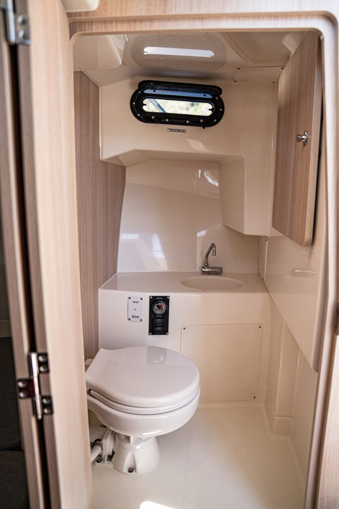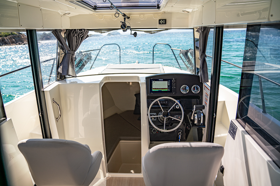W podstawowej wersji, obok stanowiska sternika na prawej burcie są przesuwane drzwi, ułatwiające sternikowi szybkie wyjście na pokład lub manewrowanie, stojąc na zewnątrz. Na testowanej łodzi takie drzwi znajdowały się po obu stronach nadbudówki. Mieliśmy także duży, otwierany świetlik w dachu. Wszystko to sprawiało, że cała kabina była doskonale wentylowana i bardzo jasna, nawet w dosyć pochmurny dzień na Lazurowym Wybrzeżu.