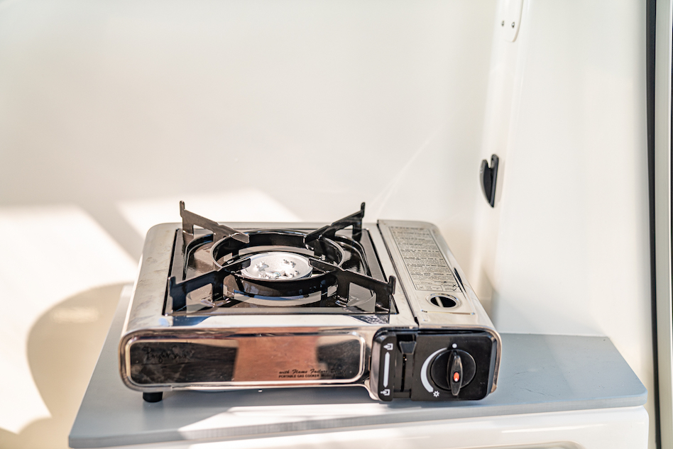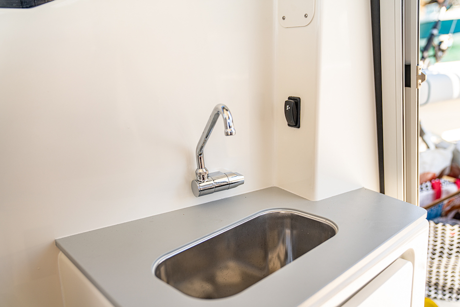 W salonie, na jego prawej burcie mamy kambuz z szafką, zlewozmywakiem i miejscem na jednopalnikową kuchenkę. Na lewej burcie znajduje się niewielka jadalnia ze składanym stołem. Jest tu też lodówka.