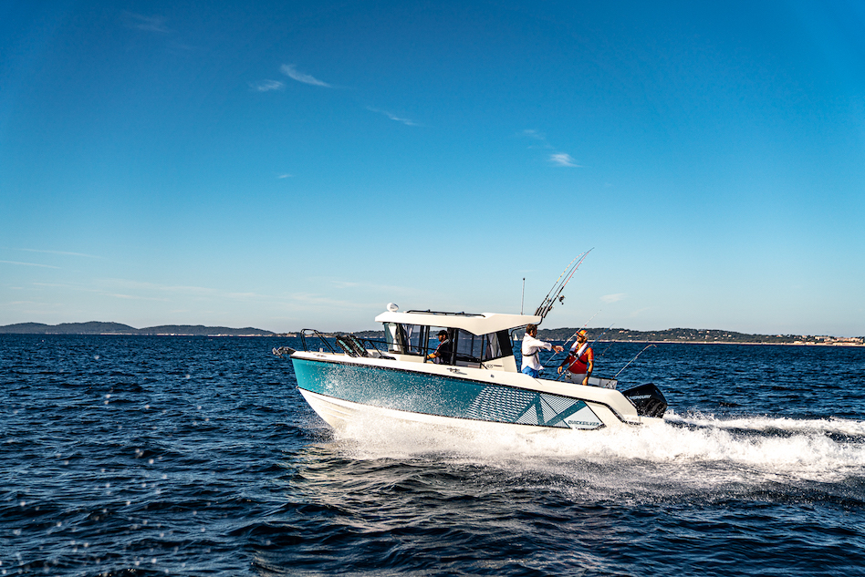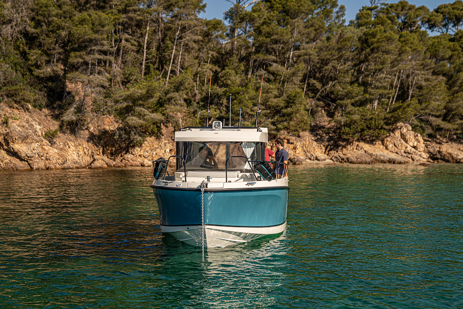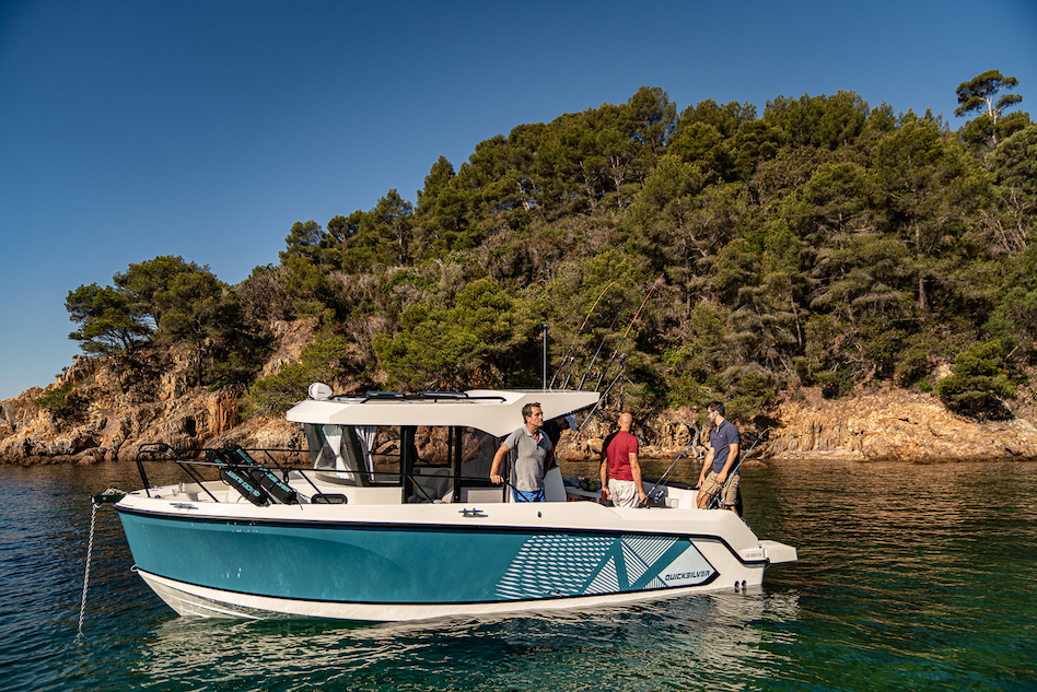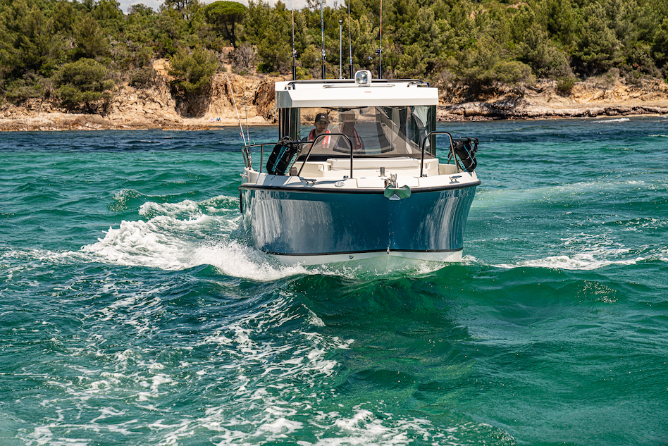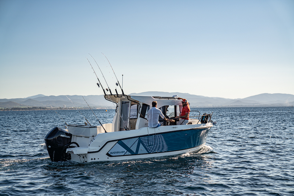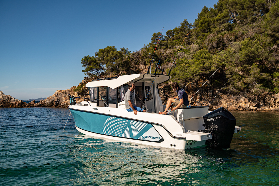 Quicksilver 805 Pilothouse, to jacht stylizacją nawiązujących do roboczych łodzi wędkarskich. Ma bezpieczne, szerokie przejścia wokół typowej dla wędkarskich łodzi “kwadratowej” nadbudówki, której owiewka skierowana jest do przodu.