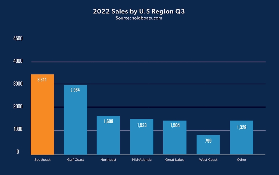 Kontynuując swoje kosmiczne tempo wzrostu po COVID-19, region Wielkich Jezior był jedynym regionem o wyższej sprzedaży w trzecim kwartale 2022 r. niż w tym samym okresie w 2021 r. Sprzedaż łodzi na tym rynku stanowiła 12% całkowitej sprzedaży w USA, co stanowi wzrost z 9% w III kwartale 2021 r.
