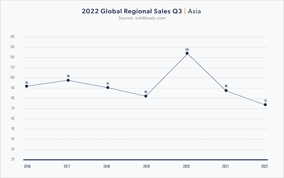 Po słabym drugim kwartale, trzeci kwartał był burzliwy dla światowego rynku jachtowego. Sprzedaż na wszystkich głównych rynkach znacznie spadła w porównaniu z Q3 2021. Ameryka Północna, największy na świecie rynek łodzi, odnotowała sprzedaż o 9,5% niższą niż w tym samym kwartale ubiegłego roku. W Europie klienci kupili o 11% mniej łodzi w typowych zagłębiach jachtingu – Francji, Włoszech, Hiszpanii i Holandii – niż w III kwartale 2021 roku. Jeszcze gorzej było w Azji, gdzie odnotowano 19% spadek zakupów w porównaniu z III kwartałem 2021 roku. Klienci w Chinach, Japonii i Singapurze kupili mniej łodzi w Q3 2022 niż w jakimkolwiek trzecim kwartale od 2015 roku!