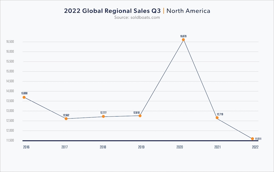 W Ameryce Północnej regiony Southeast, Gulf Coast, Northeast i Mid-Atlantic pozostały dominującymi rynkami jachtowymi przez trzeci kwartał z rzędu. Zbiorczo, sprzedaż na tych rynkach spadła o 10% w stosunku do trzeciego kwartału 2021 roku, ale nadal stanowiła ponad 70% całkowitej sprzedaży w USA.