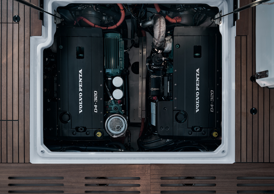 Równoległa hybryda typu plug-in, wyposażona w dwa silniki Volvo Penta D4-320 oraz dwa silniki elektryczne o mocy 60 kW, oferuje trzy tryby jazdy: elektryczny, hybrydowy i Power. Zintegrowany system z unikalnie opracowanym interfejsem człowiek-maszyna (HMI) odróżnia ten statek od konkurencji, umożliwiając żeglarzowi płynne przełączanie między trybami jazdy, zwiększając wydajność i komfort na pokładzie.