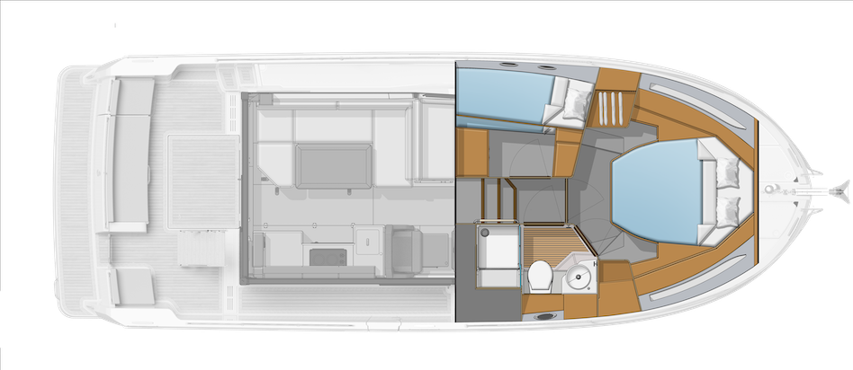 Testowany przez nas model wykonany był w wersji flybridge, ale można go zamówić również w linii „sedan”,bez rozbudowanego górnego pokładu. Myślę jednak, że warto dołożyć „kilka złotych” i zdecydować się na bogatszą wersję z obszernym i wygodnym „tarasem”, doskonale sprawdzającym się szczególnie podczas wypraw przy ładnej pogodzie. Poza tym oferuje więcej miejsca do relaksu i wypoczynku.