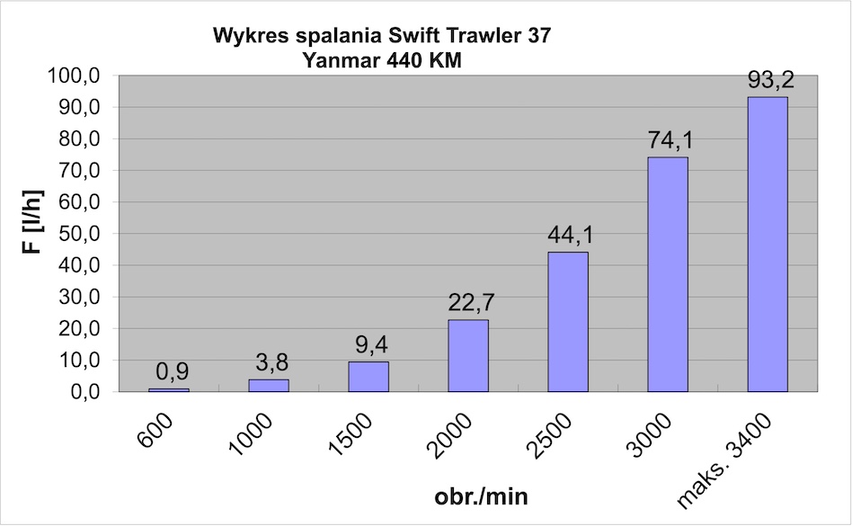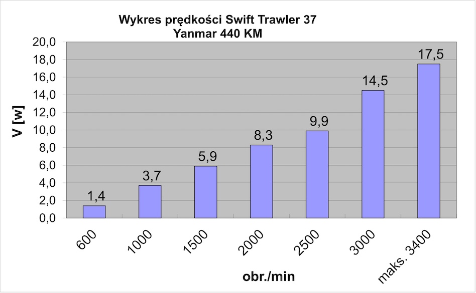 Testowany przez nas Swift Trawler 37 wyposażony był w pojedynczy układ napędowy z silnikiem o mocy 440 KM i wałem prostym. Jacht nie osiąga oszałamiających i dynamicznym parametrów jazdy, ale nie jest on przeznaczony do szaleństw na wodzie, a jedynie do komfortowego i wygodnego poruszania się po szlakach wodnych. Maksymalnie, udało nam się go rozpędzić do 17,5 w i co ciekawe, potrafił wtedy uzyskać nawet ślizg. Ale najlepiej pływa się z szybkością podróżną 8 – 10 w, realizowaną w zakresie 2000 – 2500 obr./min. Jest wtedy komfortowo i cicho, a zasięg pływania umożliwia dalekie rejsy morskie. Spalanie podczas takiego tempa podróżnego wynosi między 22 a 40 l/h, a poziom hałasu osiąga wartość 72 – 76 dB. Do porównania na załączonych wykresach.